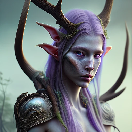 portrait painting of an elven eladrin young woman barbarian with short light purple hair and freckles and tribal tattoos on her cheekbones and deer antlers on forehead, foliage armor, ultra realistic, concept art, intricate details, eerie, highly detailed, photorealistic, octane render, 8 k, unreal engine. art by artgerm and greg rutkowski and charlie bowater and magali villeneuve and alphonse mucha