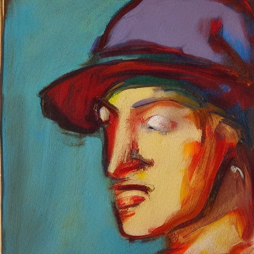 An expressive portrait painting with a dramatic use of color, featuring a person with bright blue eyes, wearing a red hat and a yellow shirt. --q 2 --s 750 --v 5