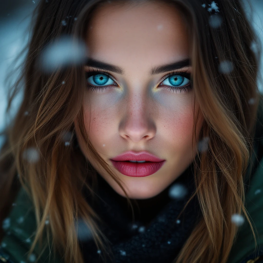 Create a Women with Blue eyes and red lips. She has Brown hair. She is 20 years old and has a Green jacket on and Stands in the Snow. Her Finger nails are painted black.