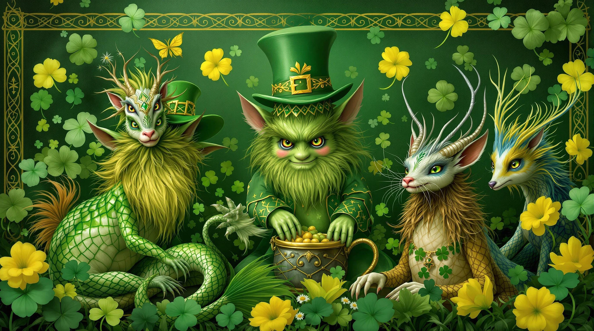 St. Patrick's Day celebration featuring mythical fantasy creatures of Ireland, such as leprechauns, merrows, and púca, amidst festive shamrocks and Celtic patterns. hyper realistsm