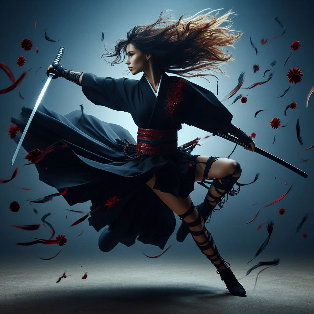 A photo of a female samurai warrior in dynamic motion, wielding a katana. She has long, wavy black hair with red highlights, and is wearing a black kimono with red highlights and a wide red obi. Her expression is stern and determined. She wears black lace-up boots and black socks. The background is a blue hue with scattered red and black feathers that add a sense of movement and intensity. The image captures a powerful, action-packed moment that emphasizes her agility and strength. Cinematic image, real female character, real artistic lighting, high quality