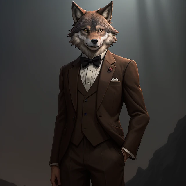high quality art by studio ghibli, moody lighting, anthropomorphic male wolf, teenager, brown fur and paws, big brown colored eyes, small smile, dressed in a black suit with a bow tie, hands in pockets, looking off into the distance, hyper realistic, extreme details, cinematic, art by Madhouse Studios
