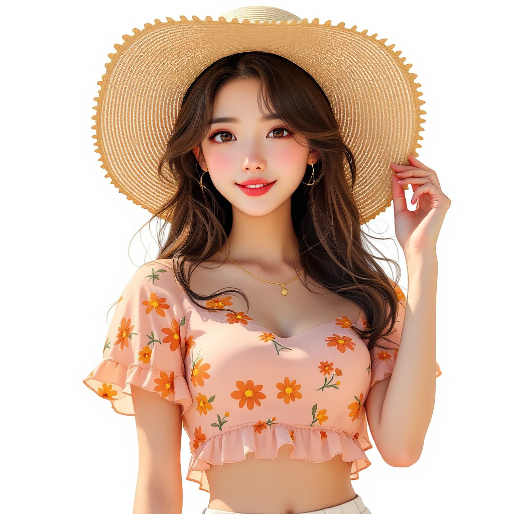 Asian female, 18-20 years old, wearing a light peach-pink, crop top with an orange and yellow floral print, ruffles at the hem, a light beige wide-brimmed sunhat adorned with yellow flowers, and light beige/white shorts. She has long, brown, wavy hair, brown eyes, a pleasant expression, and light rosy cheeks. She is holding her sunhat with her right hand, her body posture relaxed and slightly angled towards the viewer. Soft, diffused sunlight is illuminating her from the upper right, creating a warm and gentle atmosphere. The background is a plain white, focusing all attention on the subject. The image style is anime, with a soft-focus, detailed rendering of light and shadow, and a vibrant yet harmonious color palette. The rendering is smooth and painterly. The image has a cheerful and summery mood, full of a youthful and attractive energy. Ultra detailed, anime style, soft lighting, --ar 1:1. 6 --v 5