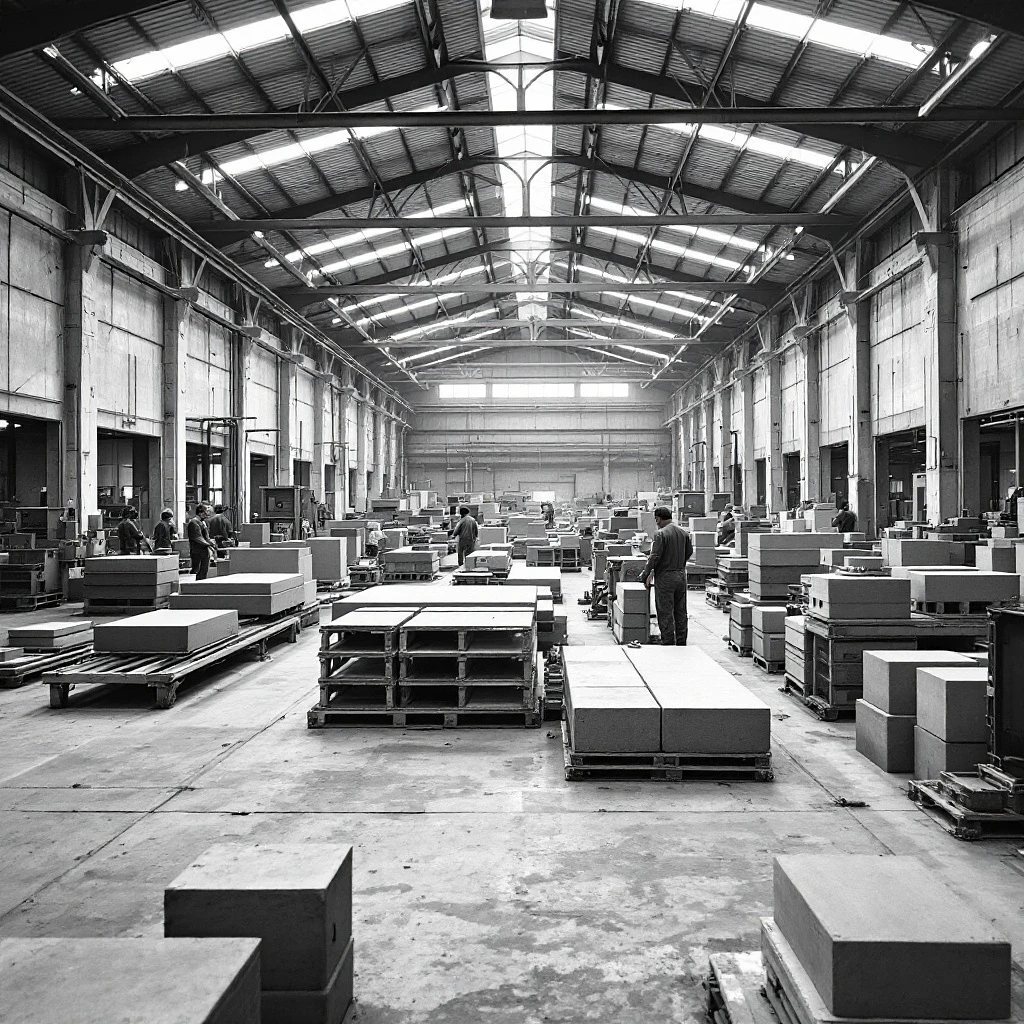 production hall interior with machines manufacturing precast concrete elements from recycled concrete, Industrial setting, steel truss, flat roof, diffuse light, clean, modern equipment, Focus on sustainability and efficient concrete production, large hall with many rooms, concrete walls, blurred people working, photo by Julius Schulman, blackened white photo, high quality