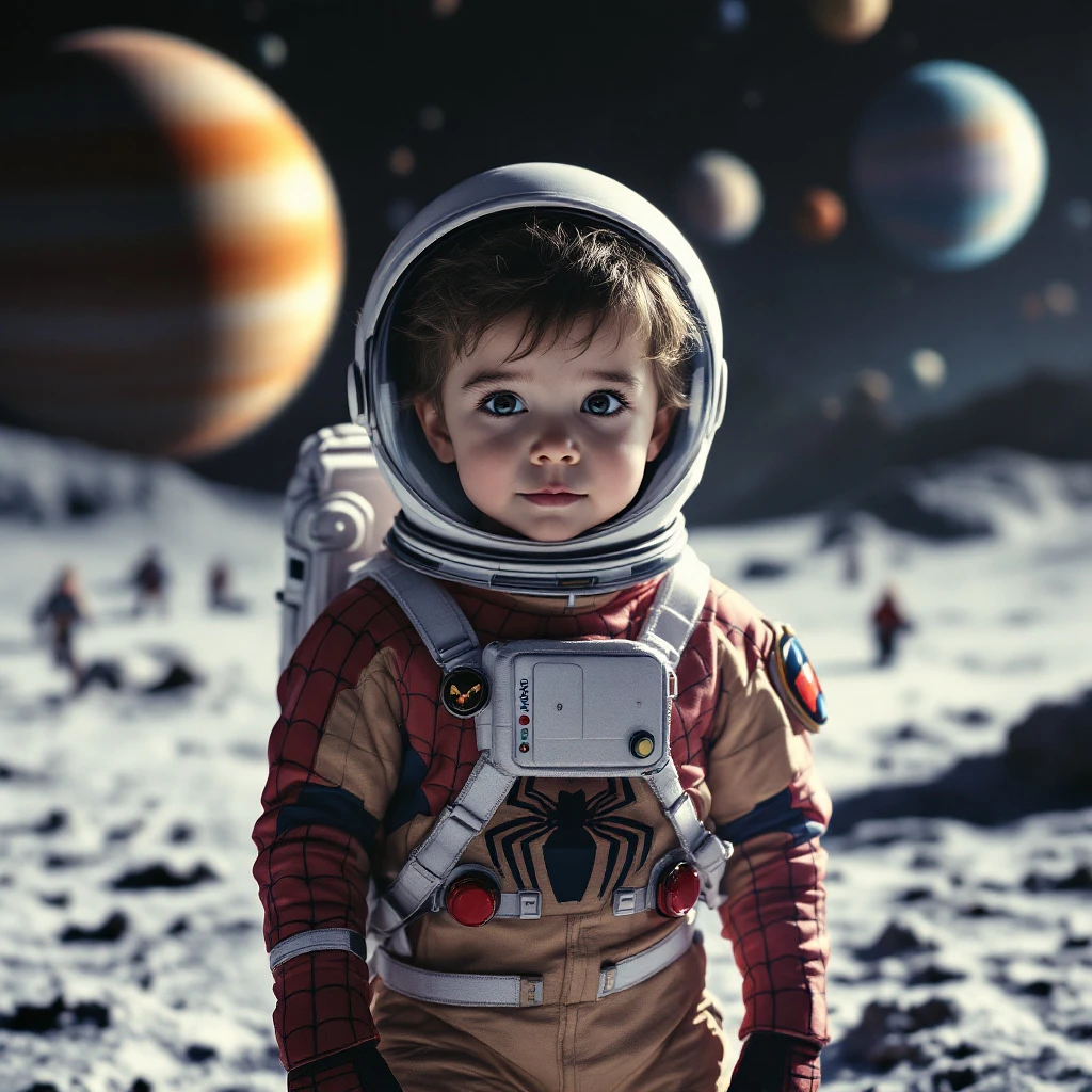"A realistic and high-quality image of a 3-4 year old child wearing a Spider-Man themed astronaut suit standing on the moon. The child's face is visible. In the background, various planets can be seen in the distance. The overall image should convey a sense of wonder and adventure. "