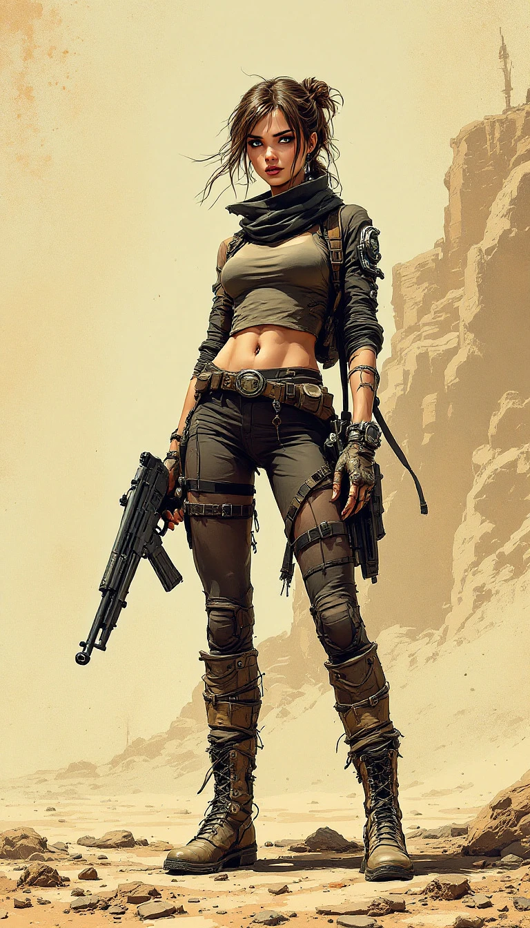 Full body shot 3/4 view, young beautiful European woman, holding a gun, random illustrations to fill a post-apocalyptic comic book, sci-fi in the style of tank girl, dirty barren world full of gangers, steampunk girls, irradiated, mutated men and women, imagine several pictures and drawings, creative, strong variations, comic style