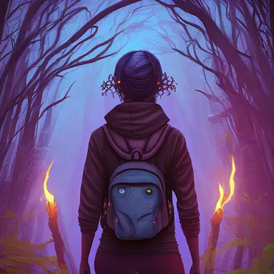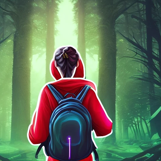 a woman with a backpack walking through a forest, comic book cover art, discord profile picture, eerie vibrancy, beautiful girl necromancer, into the void, looking left, looking straight forward, girl wearing hoodie, maze like, greta thunberg, tomb raider beautiful, explorer