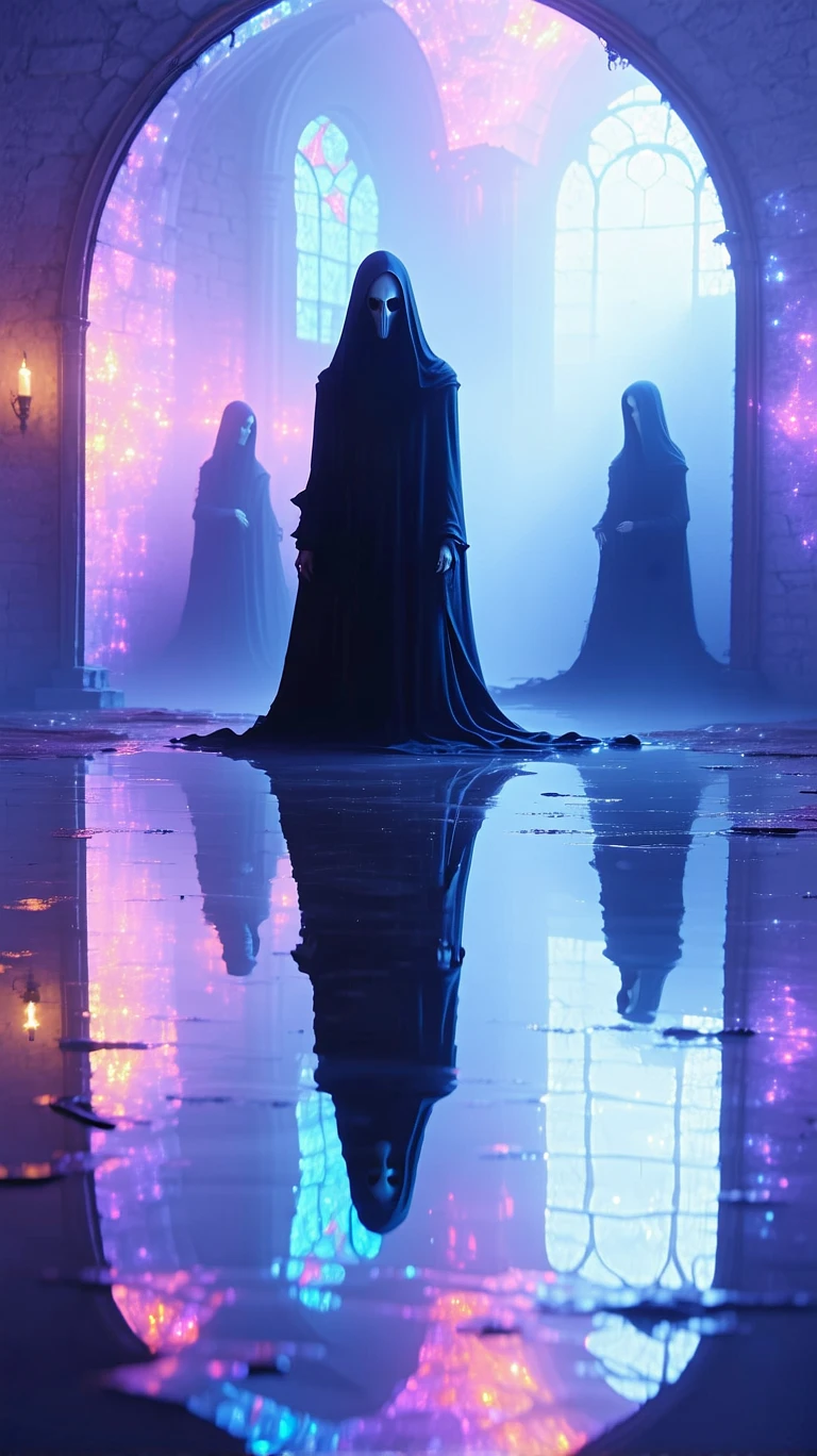 Gothic mirror, holographic reflections of ghost and scary human, dissolving silhouettes of human and ghost, 8K, 35 mm canon, dslr
