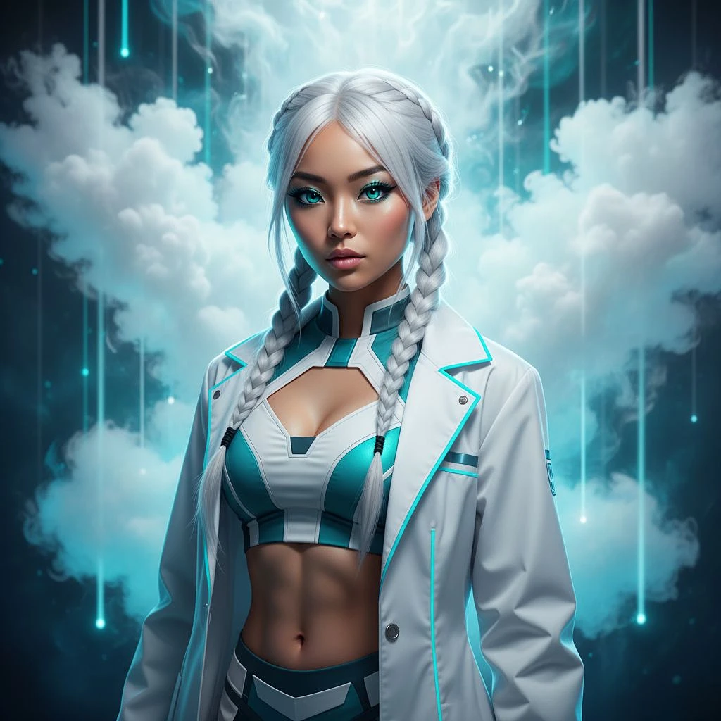 white hair, beautiful young asian girl, beautiful eyes, olive skin, four pigtails, petite body, small breasts, toned body, labcoat, unearthly futuristic, white, teal, and cyan color scheme, showing midriff, perfect face, neon light smoke background, volumetric fog, Hyperrealism, cinematic lighting, highly detailed, breathtaking, 8k uhd