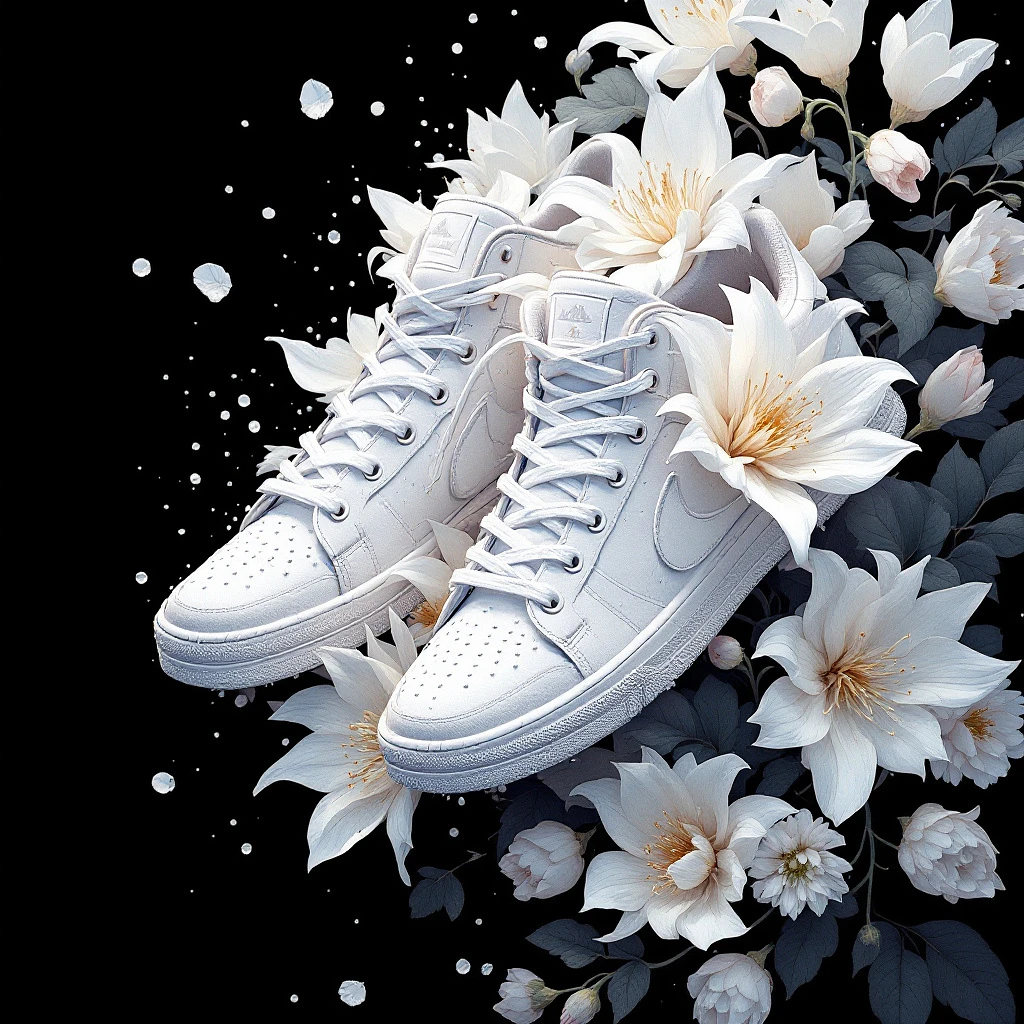 illustrate an intricate Demix sneakers arrangement bursting with life against a stark black background, focus on detailed petals of deep stark whites, each stroke adding depth and realism to sneakers, sneakers should appear luminous, with dewdrops accenting their edges, giving a fresh and serene vibe, overall composition should balance vibrant life of sneakers with void-like darkness, creating a striking contrast --ar 9:16 --style raw