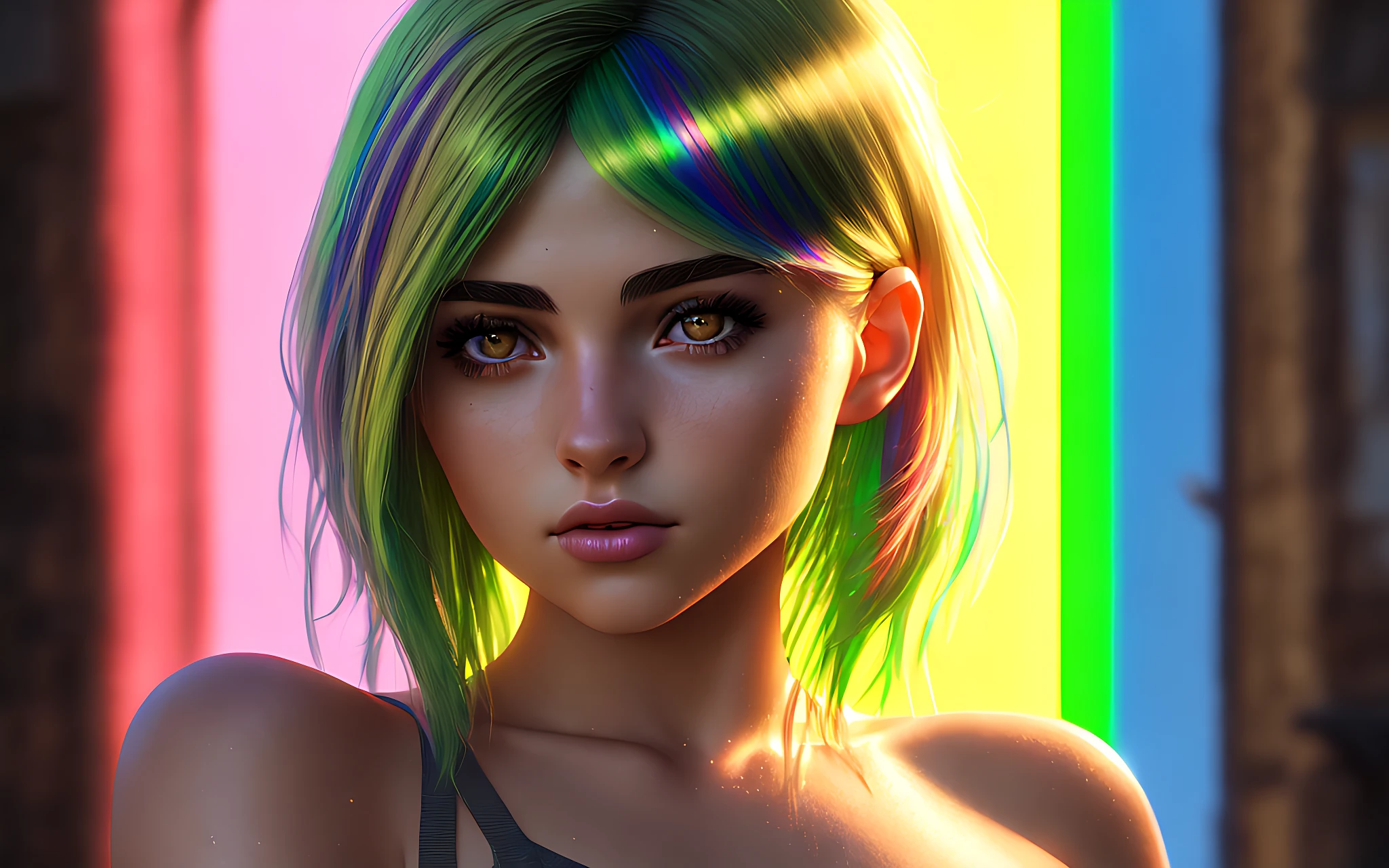 ultra realistic, ultra detailed, beautiful young girl, olive skin, detailed gorgeous face, medium length rainbow hair, cinematic lighting, lumen reflections, photography, stunning environment, Hyperrealism