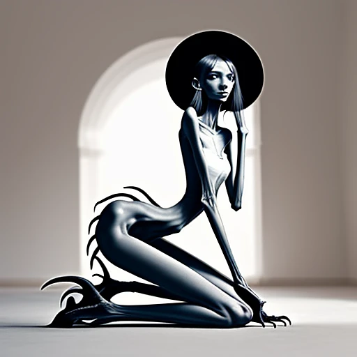 very skinny slender girl, with long curved claws, skinny legs and long skinny calves in high heels and kneeling position, with extra long and strong curved claws