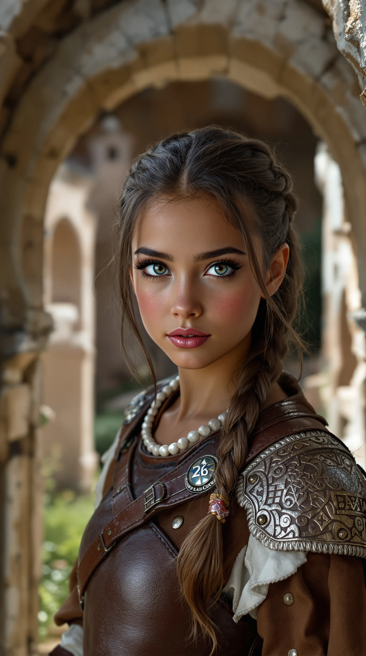 A stunning professional photograph of the most beautiful girl in the world, a second-grader, depicted in a Renaissance style with realistic and flawless anatomy, showing her full body. She has medium brown hair styled in a tight braid, perfectly smooth olive skin, thick black eyeliner, exceptionally long eyelashes, a light pink blush, exquisitely shaped lips with light pink lipstick, and blue eyeshadow. Her eyes are a striking blend of forest tea grey, and purple hues, with perfectly sculpted high cheekbones. She is dressed as a 14th-century warrior, wearing leather armor standing in archway of a dilapidated castle. The image is created using Unreal Engine 5 and Octane Render, featuring high-resolution photography with intricate details and ultra-sharp focus. The artwork is of the highest quality, 8K resolution, ultra-detailed, photo-realistic, and masterfully crafted with dramatic volumetric lighting, showing a full front view of the subject. Negative prompts exclude any Asian features, poor artistry, anatomical errors, low resolution, text, watermarks, or any distortions, ensuring a perfect and flawless image.