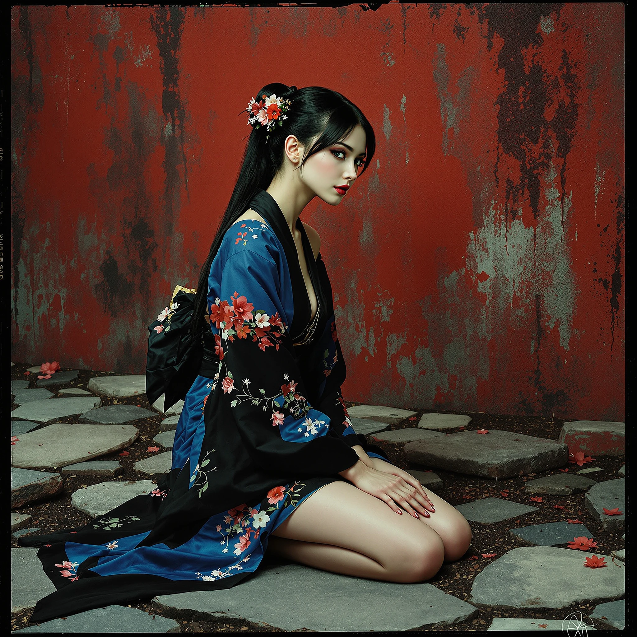 A full-length, three-quarter view. A woman of incredible beauty (delicate blue eyes, pale, luminous skin) wears a very short blue and black kimono that falls to one shoulder. Her long black hair is pulled back in an elegant ponytail, with flowers in her hair, and her expression is serene. She kneels barefoot (((shows her foot) )), on a stone floor, in a surreal, expressionist garden with random textures. A soft, warm light, coming from a single source from above, casts delicate shadows, enhancing the intimate, ethereal atmosphere. The scene is framed by a subtle film grain and a rich, deep red and black color palette, reminiscent of the styles of Franz Marc and Max Ernst.