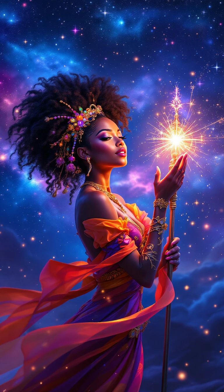 "Radiant Voyager with a Playful Heart": A vibrant image depicts a stunning woman, gracefully maneuvering a shimmering staff against the breathtaking panorama of a starry night. Her deep umber skin radiates under the soft glow of the cosmos, and she strikes a whimsical pose, with her elaborate hairstyle and colorful garments creating a sense of charm and wonder. The artist's unique blend of light-hearted fantasy with grounded detail brings this enchanting voyager to life, creating a buzz in the digital art world.