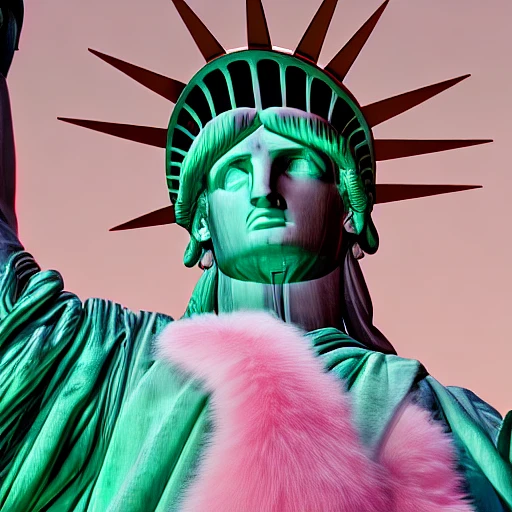 Statue of Liberty wearing a pink fluffy fur coat, 8k octane rendering, high resolution photography, hyperrealism, insanely detailed, 8k, ultra realistic, commercial photography, professional color grading, --ar 4:5 --q 2