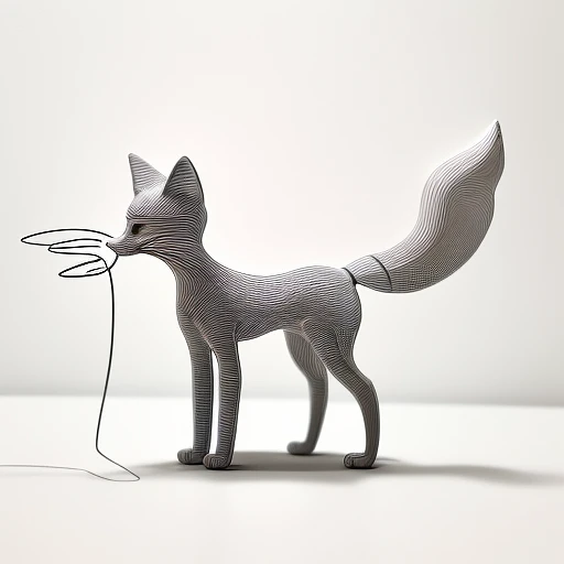 A graceful and 3D minimalist wire sculpture of a cat in a squiggly line drawing style, utilizing only a few strokes for a simplistic yet visually appealing design. The main lines are drawn in dark grey, while a subtle touch of pastel pink adds depth and warmth to the fox's detailing. The background is clean and simple, allowing the fox to stand out with its bold and stylish presence. The overall composition creates a sense of balance and harmony, capturing the essence of the subject in an elegant manner. , vibrant, conceptual art, fashion, illustration