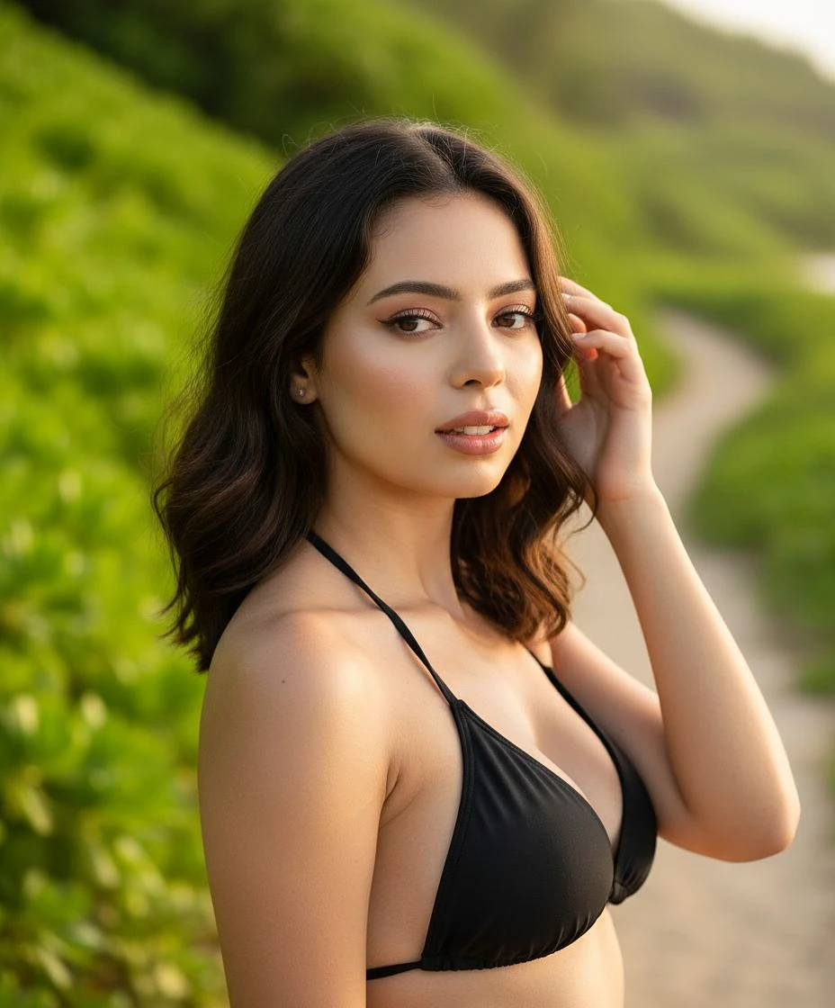 A young woman with shoulder-length, dark brown hair styled to the side stands outdoors, her confident, serene expression enhanced by her black strappy bikini. Her right hand gently touches her hair, and she is slightly turned to the right, showing a side profile. The scene is bathed in soft, golden hour light, casting a warm, natural glow on her olive-toned skin. The background features a lush, green landscape with a gentle, sunlit path leading into the distance. The lighting is a balanced mix of natural sunlight and subtle fill lights to highlight her features. aidmaRealisticPeoplePhotograph