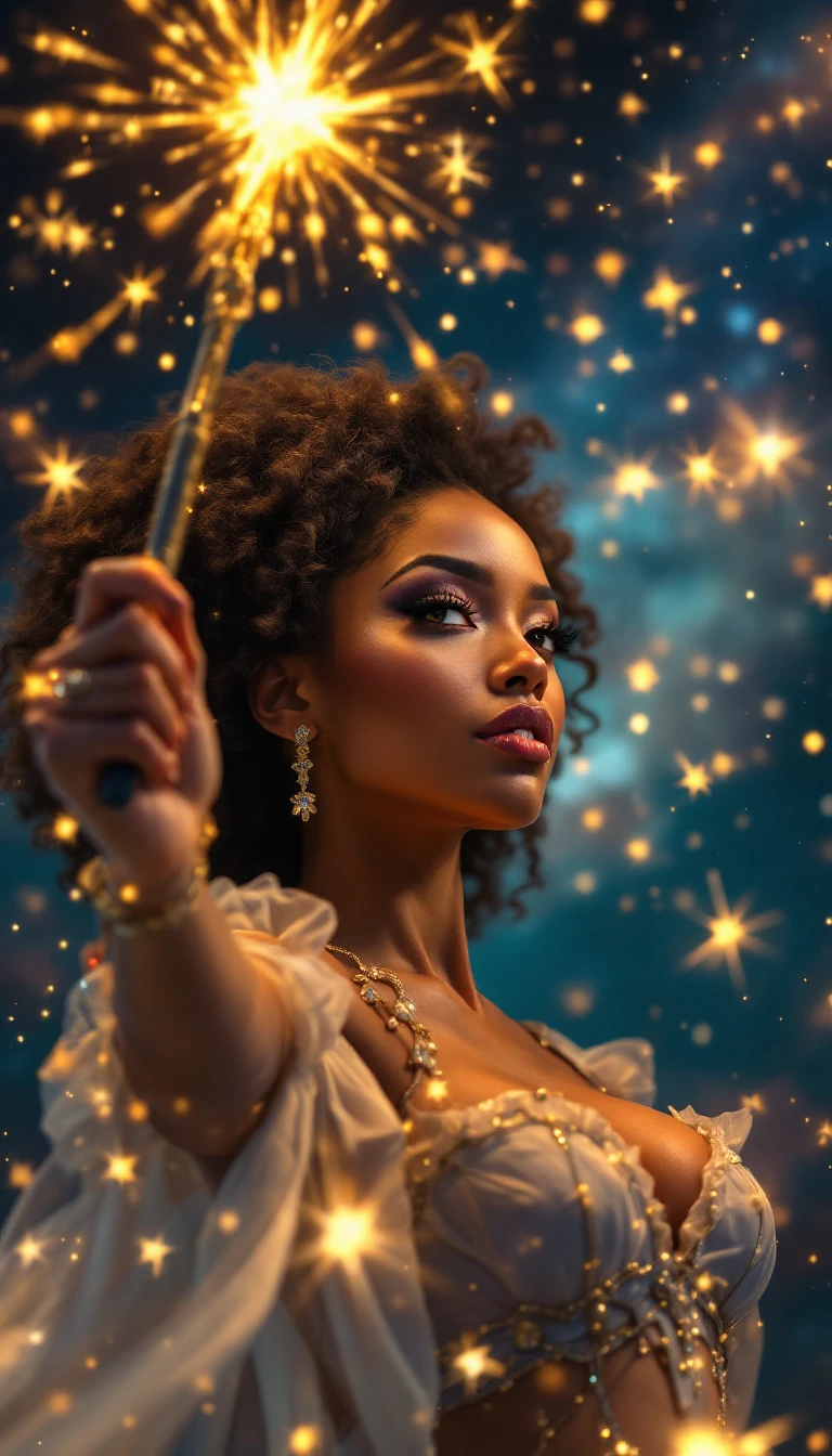 "Celestial Dreamer with a Spark of Magic": A vibrant image captures a beautiful woman, effortlessly wielding a glowing wand amidst a breathtaking starry night sky. Her rich, caramel skin glistens softly in the starlight, and she strikes a whimsical pose, her bold hairstyle and intricate outfit creating a playful, yet powerful impression. The artist’s unique fusion of dreamy fantasy with a touch of realistic detail brings this enchanting dreamer to life, ensuring she is a standout creation in the digital art community.