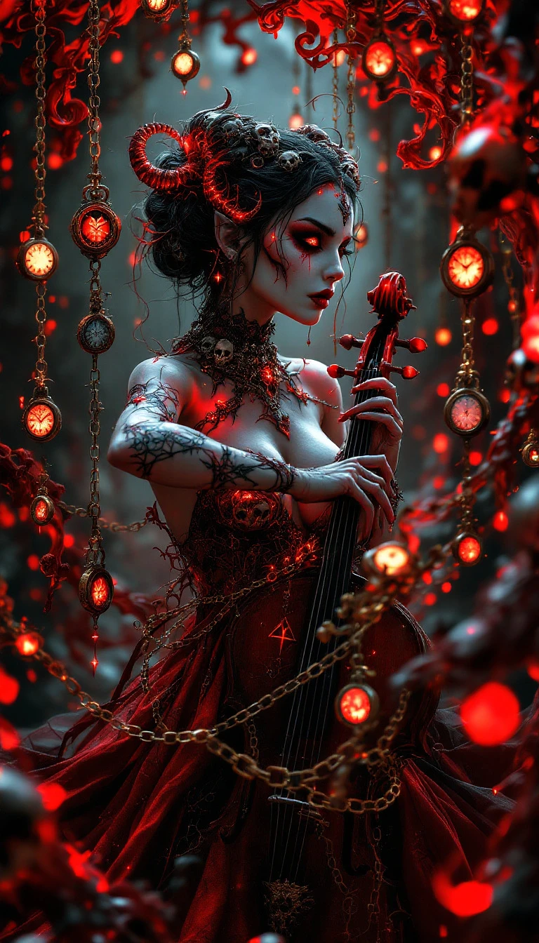 "Ember Echo: Scarlet Spiral": A hyper realistic and ultra detailed photorealistic horrorcore picture shows a fierce, but alluring female demonic character, a rottencore fractal entity, with a long, flowing scarlet dress with skulls attached, and with intricate bone accessories. She is covered in sacred geometry tattoos that glow with a luminous red, playing a fractalized cello in a series of dynamic poses, and framed in an oblique shot view. Her body coils and contorts while she is bound with heavy golden chains, adorned with hanging pocket watches in a mandelbrot fractal set, curling and spiraling into the background like flames. The piece is done with crystal clear imagery, using ray tracing and global illumination for a richly textured finish, and creating the illusion of three-dimensionality.