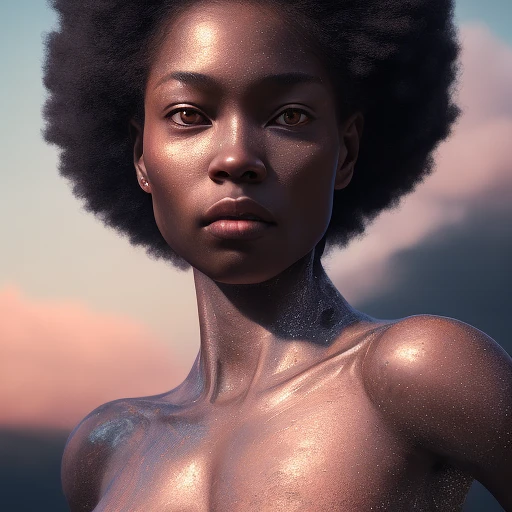 Photo of a ultra real black women, dramatic light, pale sunrise, cinematic lighting, battered, low angle, trending on artstation, 4k, hyper realistic, focused, extreme details, unreal engine 5, cinematic, masterpiece, art by studio ghibli, intricate artwork by john william turner