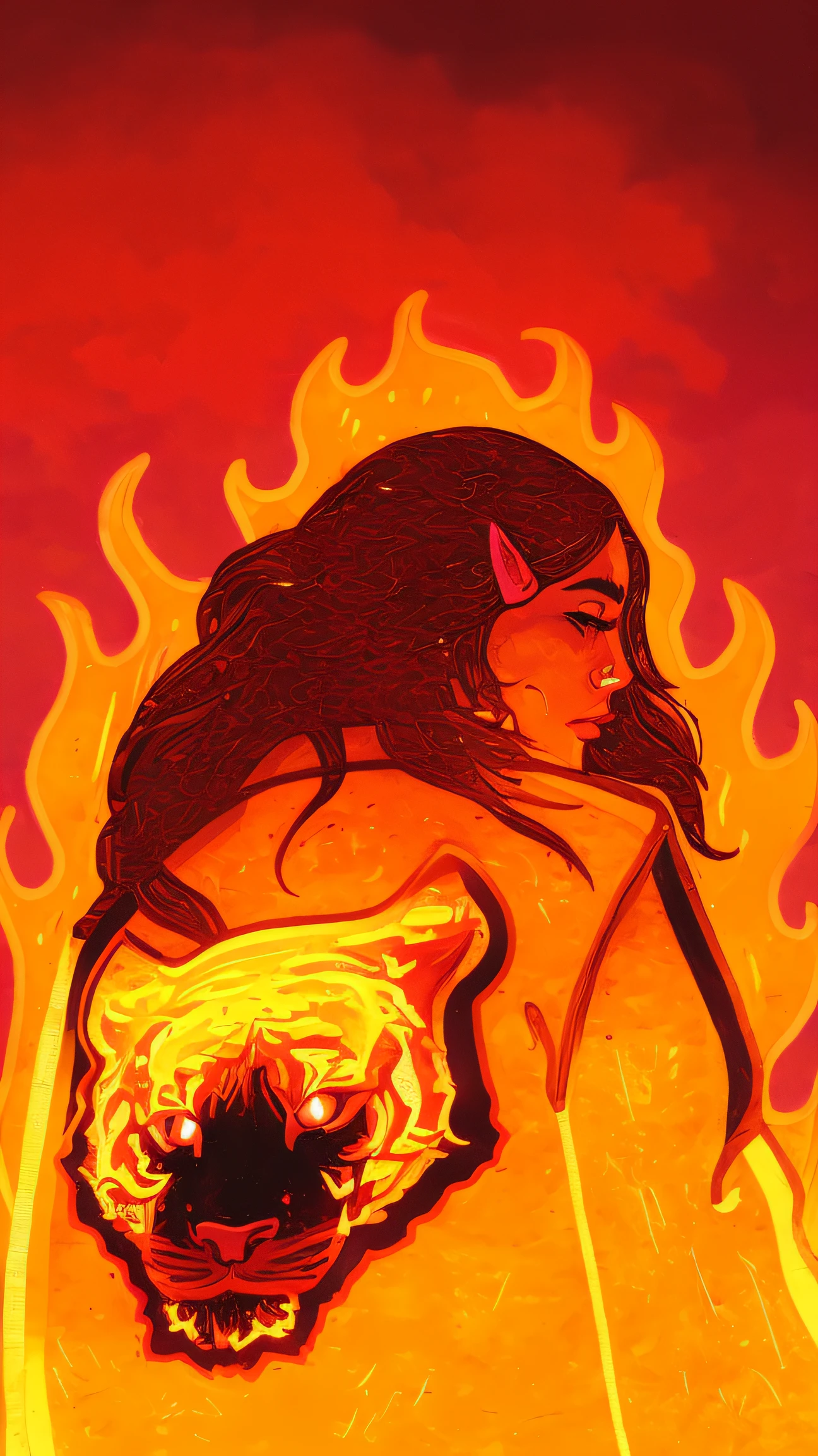 a close up of a painting of a woman with a tiger on her shoulder, jen bartel, cliff chiang, illustration style, satoshi kon artstyle, butcher billy style, inspired by Satoshi Kon, colorfull illustration, style of satoshi kon, flames surround her, her body made of flames, vibrant fan art, by Brian Fies, colorful illustration