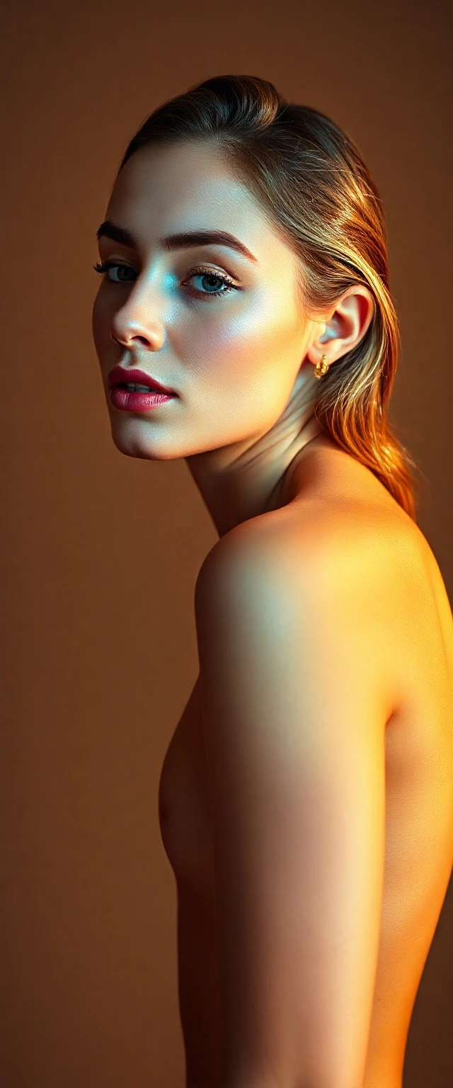 "A fine art full body photograph of a graceful, elegant supermodel in her early twenties, captured in a modernist style. The image employs soft, warm lighting with bright vibrant colours and diffused shadows. Subtle illumination highlights her refined features and energetic demeanour. The photo evokes a professional, high-quality feel. "