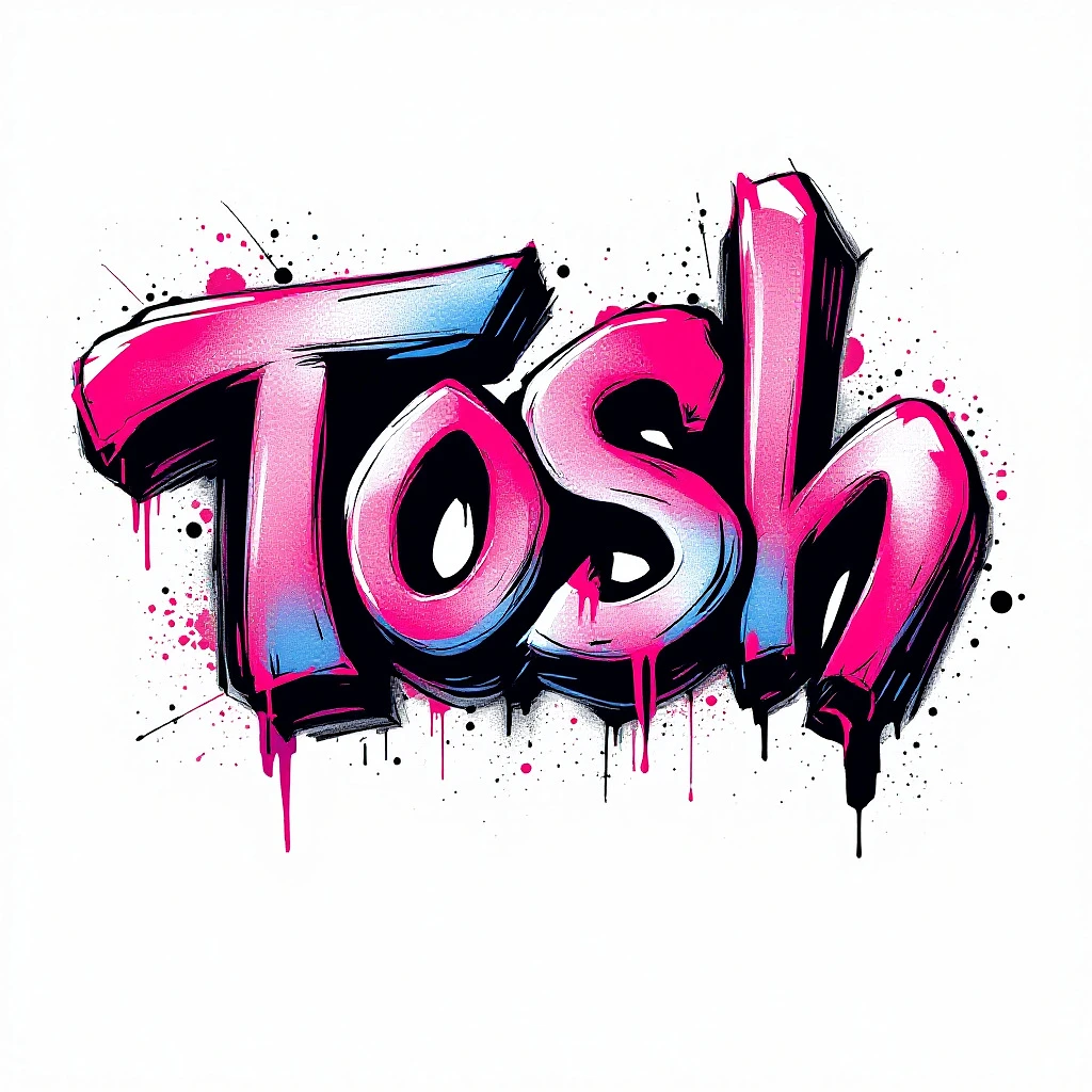 a graffiti but cool 'Tosh', isolated on white backgorund. the letters merged and overlapped each other, flowing together, creating a unique typography