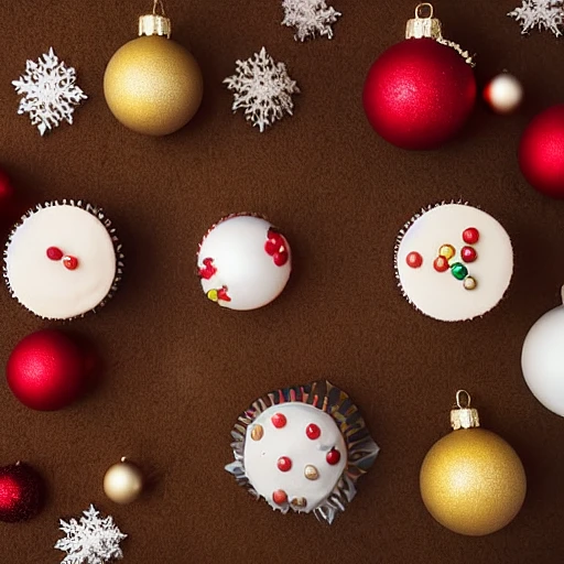 cupcakes and christmas ornaments trendy stock photo holiday theme top view artistic layout soft brown theme, christmas, digital art, concept art, detailed, lovely colors, art station 3 d, 4 k beautiful, 8 k resolution, food photography, studio lighting, sharp focus, hyper - detailed