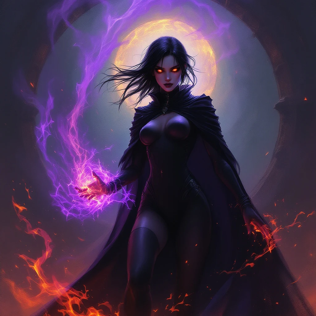 simple blurry painting in the style of warhammer 40k of a female witch, standing infront a gothic circh, channeling pruple and orange hellfire magic, cybereyes, black tight onepiece suit, mantle with high collar, black hair, latina skin
