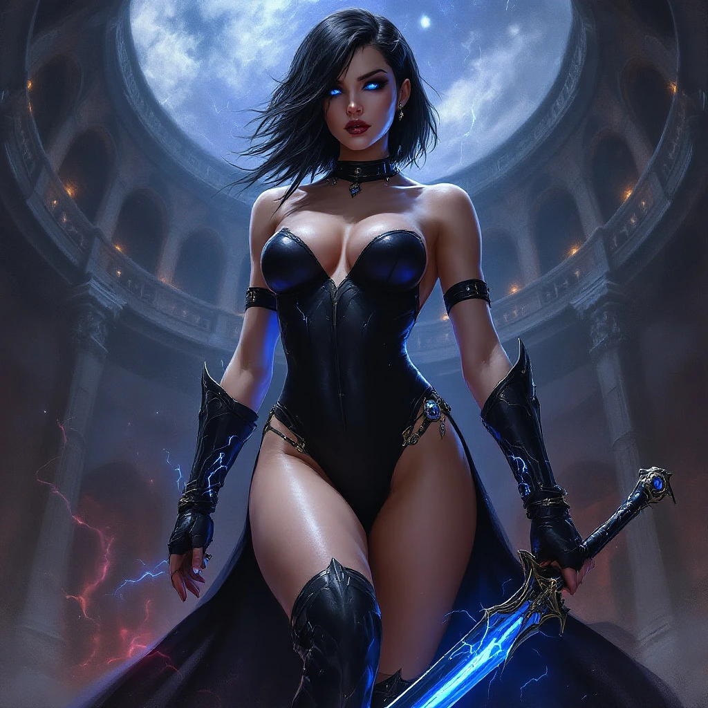 painting in the style of warhammer 40k of a female comissar, standing infront a gothic circh, holding a sabre with blue lightning, cybereyes, black ultra tight onepiece bathsuit, black sidecut hair, very big tits