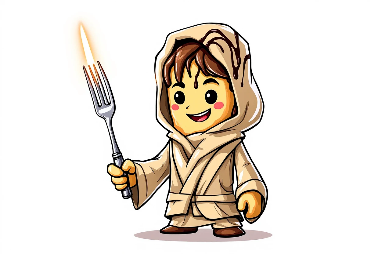 "A cartoon cannoli dessert dressed as luke skywalker, holding a glowing fork instead of a light saber, robe and hood detailed with chocolate drizzle, smiling, cartoon food humor, clean white background, digital illustration style"