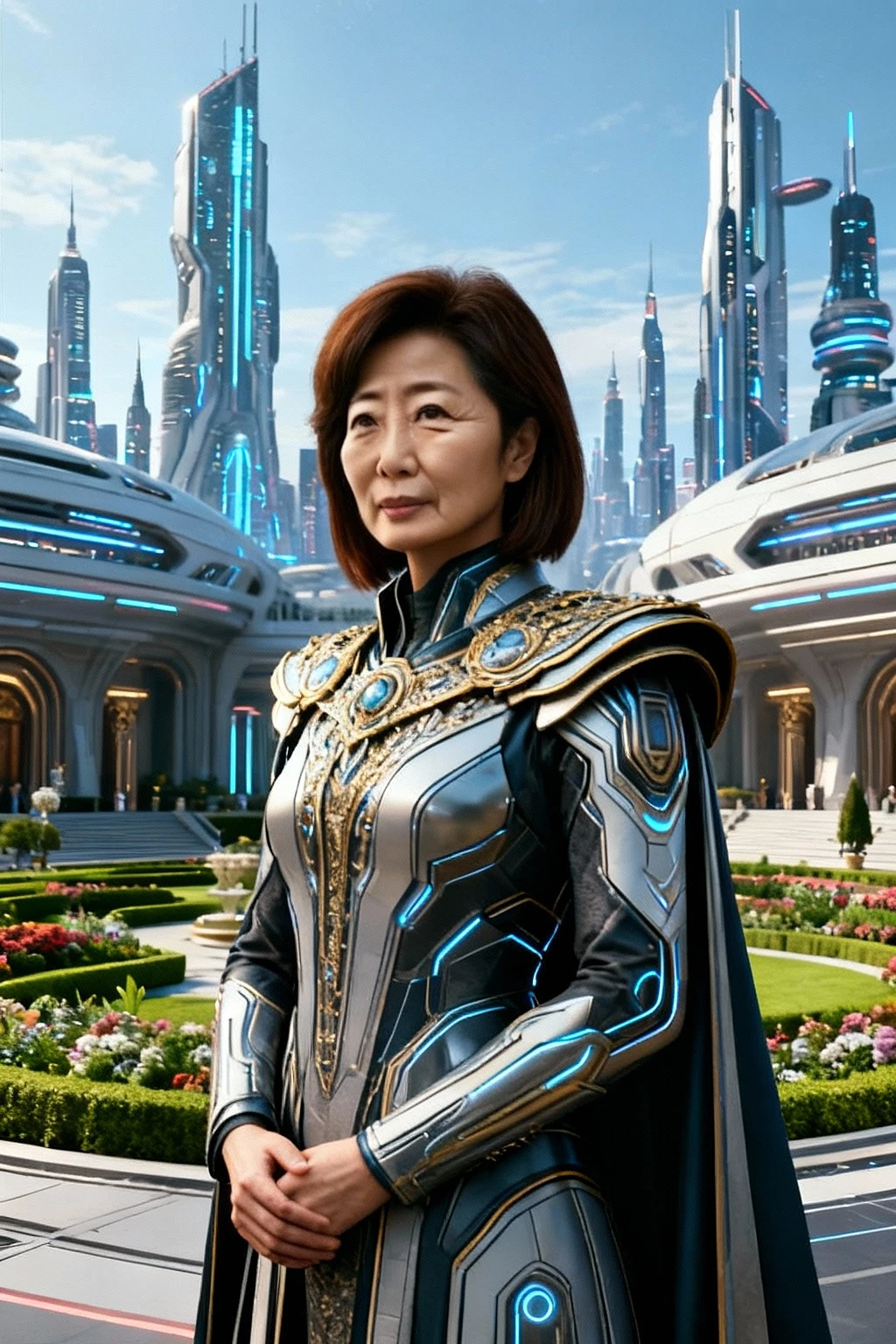 New Picture of the character in a different pose and futuristic attire. Younger looking, remove facial lines. Make her attractive and worthy of honor. A dignified statesperson of high authority within a higher futuristic government of an alien world. Show in the background a fitting image of the city in image 2 (Court Yard, Garden, Chamber Halls) , and a fitting image and attire of their role. Unreal Engine 5 Ultra-realistic—intelligent, regal, harmonious.