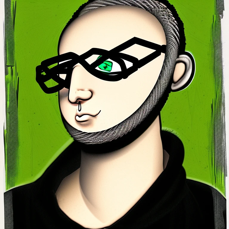 poetic image of a man without hair, with vintage black glasses and green eyes, whose gaze is turned towards the sky. Wrapped in LAN cables and surrounded by laptops, it sits amidst trees that blend with electrical wires. The sky is painted an ethereal yellow, dotted with white clouds dancing in the wind