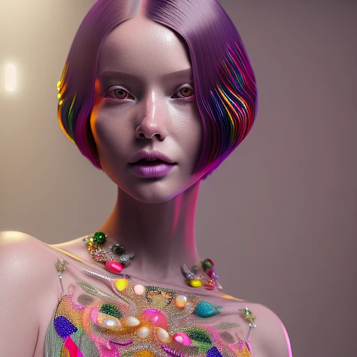 photorealistic image of short long bob hair model wearing colourful haute couture silky flowing dress and rich jewelry walking down the catwalk, light coming from side spotlights, volumetric stage light, spotlight on model, intricate detail, fashion photography award, realistic photography, octane rendering, 8k