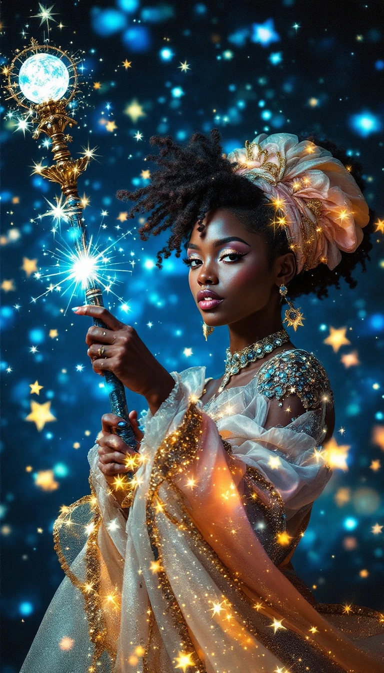 "Starlight Sorceress in Cosmic Dance": A vibrant image portrays a captivating woman, effortlessly manipulating a shimmering staff against a backdrop of a starry night. Her rich, ebony skin gleams under the delicate light of twinkling constellations, and she strikes a fashionable pose, with her unique hairstyle and attire exuding a playful and charming allure. The artist’s innovative fusion of whimsical elements and realistic techniques brings this chic sorceress to life, creating an instant impact on the digital art community.