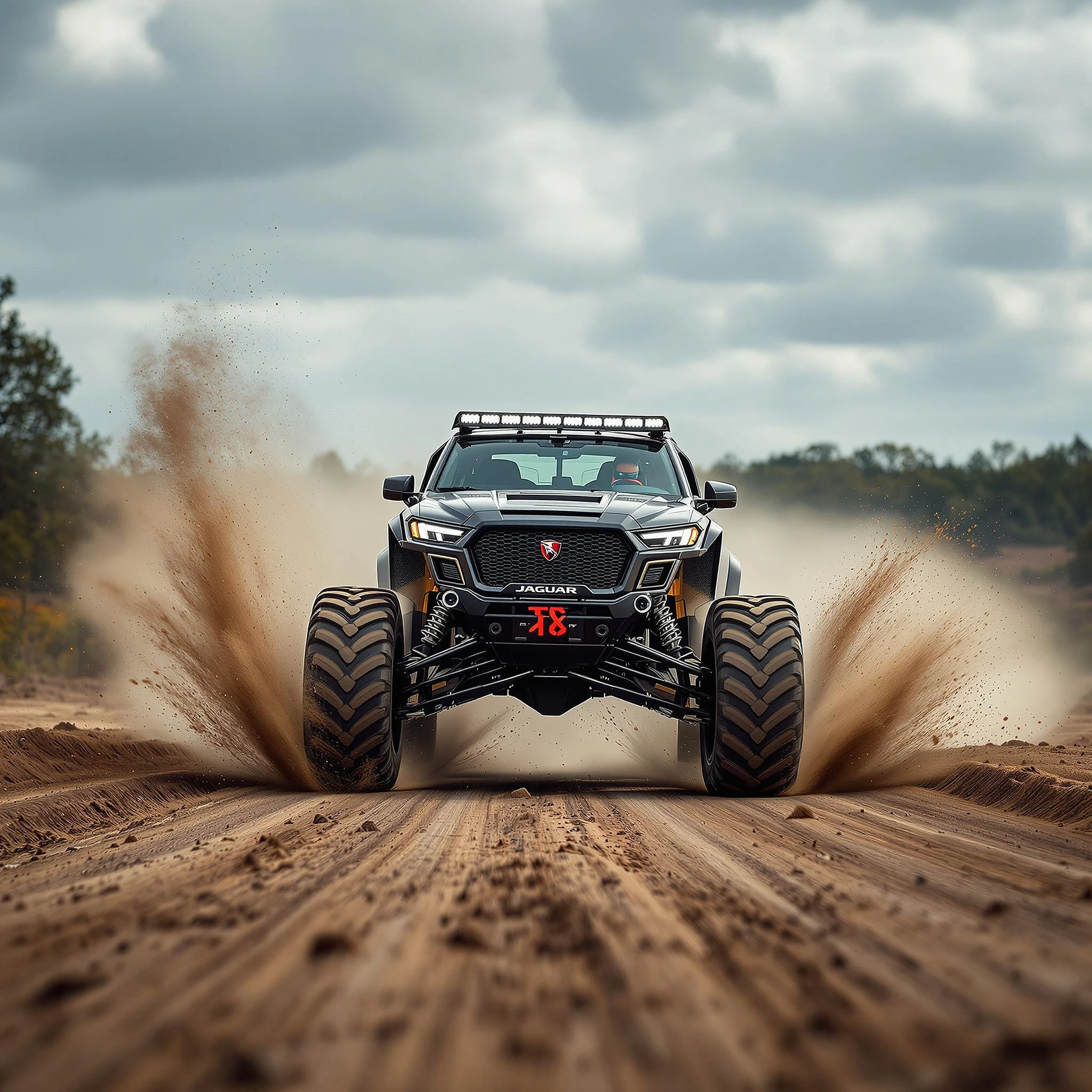 photography, sports shooting, dynamic range, dynamic motion with jaguar ftype 4x4 Monster Truck driving towards camera