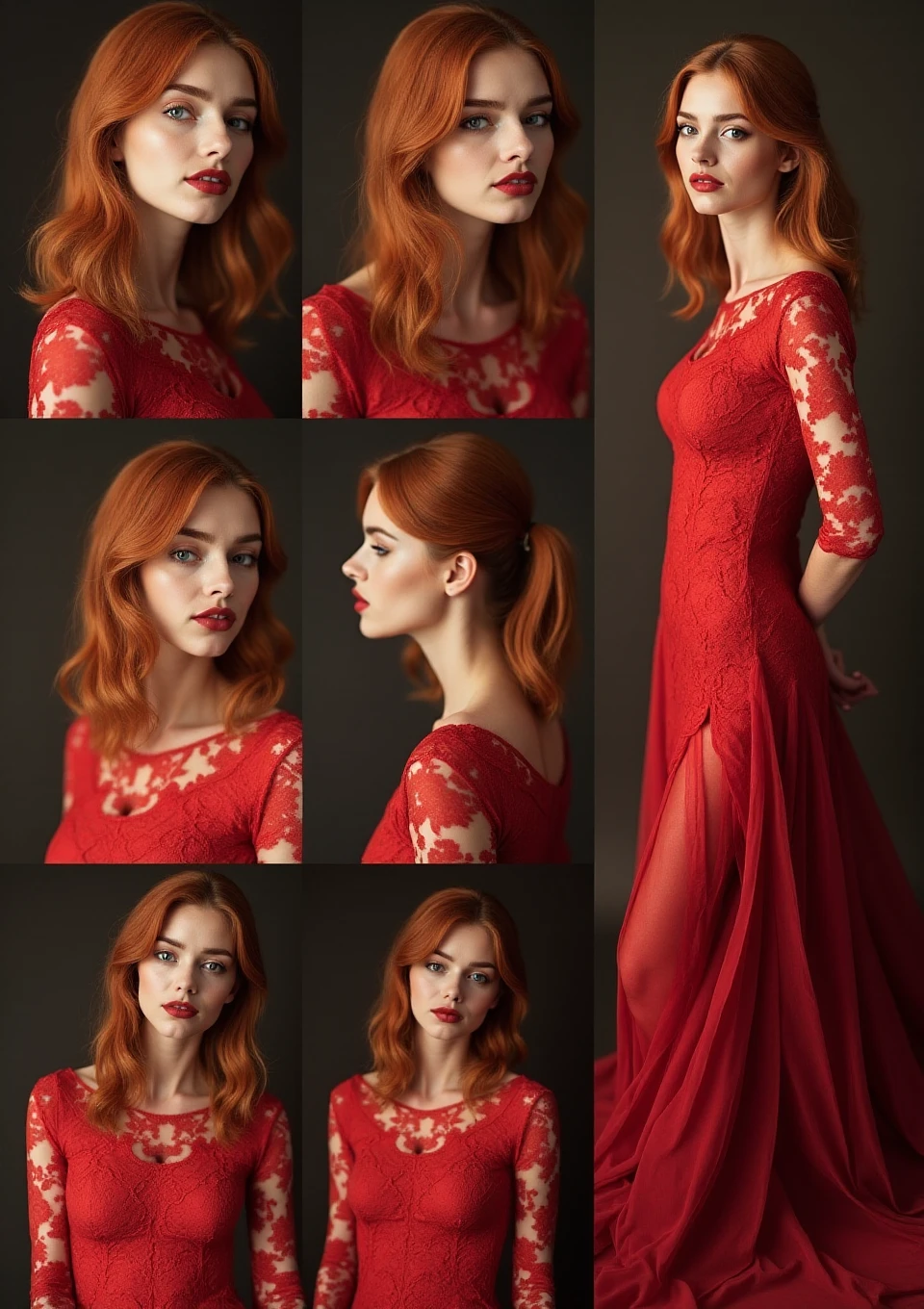 ((Collage of photos) ) of a woman with reddish blonde hair and red lips wearing a (red lace dress) in different poses. (Collage-style, highly detailed, ultra-realistic, studio lighting, ambient lighting, soft shadows, professional, 24k)