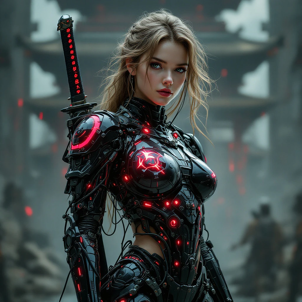 in the style of ck-sfc, female cyberpunk samurai robot, standing full body showing, young woman's face, flowing light brown hair, very reflective black and neon red armor, robot joints, body made of metals, cables and wires, a katana strapped to the back, abstract background suggesting a Japanese temple