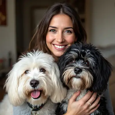 one 45 year old woman with 2 havanese dogs, a white havanese dog and a black havanese dog