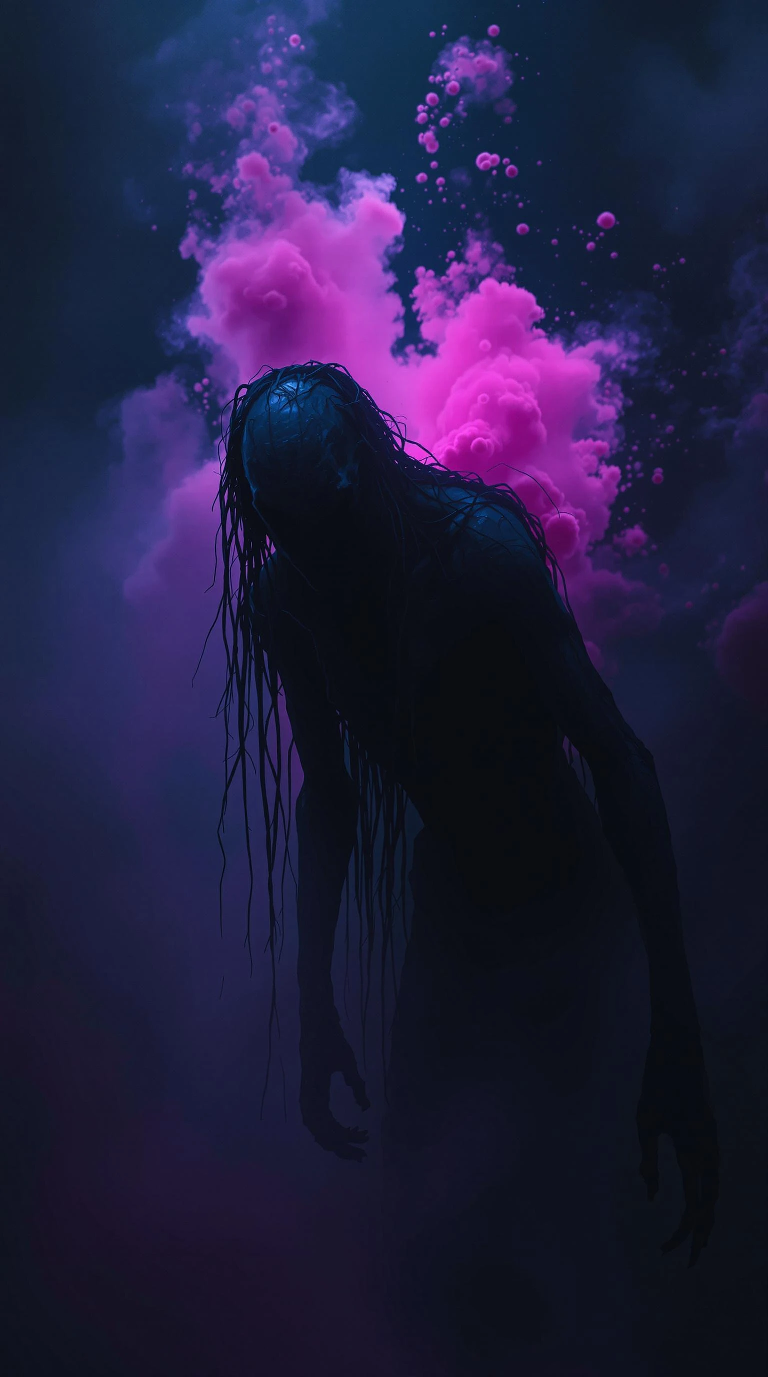 The image depicts a dark, eerie figure emerging from a misty, dimly lit environment. The figure appears humanoid but has exaggerated, unnatural features, including elongated limbs and a gaunt appearance. Its skin is a deep, shadowy hue, contributing to the unsettling atmosphere. The character has long, stringy hair or tendrils, adding to its otherworldly presence. In the background, there are hints of vibrant pink splashes or fog, contrasting sharply with the dark figure and creating a striking visual effect. This use of color, combined with the low lighting and mist, enhances the overall sense of mystery and tension in the scene, suggesting a surreal or fantastical narrative. The composition evokes feelings of intrigue and perhaps fear, as if the figure is either emerging from or blending into a strange, dreamlike setting.