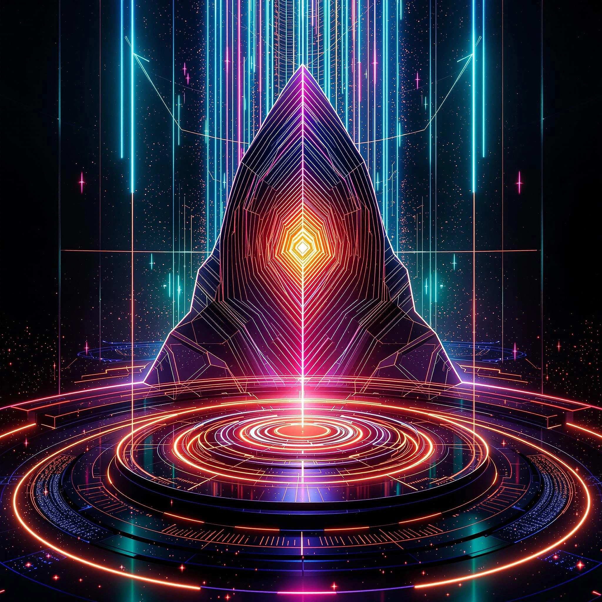 (masterpiece, digital art:1.5) , hyper-detailed, cinematic Melodic Techno album cover inspired by futuristic abstract shapes and soundwave visuals. The concept focuses on the interplay of light, form, and color to evoke the spirit of the genre without relying auf typische Cyberpunk-Elemente. The scene is centered around an enigmatic, abstract representation of rhythm and sound, designed to engage the viewer's senses and stir curiosity. At the center of the cover, a highly stylized, almost surreal geometric shape emerges from the middle of the composition, formed from intricately layered soundwave patterns, fractal geometries, and metallic lines that bend and twist in a harmonious yet chaotic dance. This central form represents the beat, the core of the Melodic Techno experience, with the forms radiating outwards in sharp, fluid motion. The waves pulse with a gradient of vibrant colors, shifting from deep electric blues to neon pinks, greens, and purples, creating an optical illusion of movement and rhythm as if the music itself is visualized in real-time. Above the central structure, light seems to fracture and split, refracting into multiple glowing beams that cut across the space in sharp angles. These beams project glowing, translucent neon accents, forming a lattice of glowing strands like rays of light bouncing off a cosmic surface. The beams reflect off abstract, polygonal surfaces scattered around the composition, which appear like shards of light, creating an otherworldly ambiance that feels like a virtual soundscape. In the lower section, an array of tiny particles and glowing dust clouds appear to float in the air, as if the atmosphere itself is reacting to the music. These particles are illuminated by soft yet intense neon lighting, adding a sense of depth and texture to the design. The background is made of dark, almost black gradients with subtle textures that resemble the surface of a vinyl record, but more fluid and organic, blending dark hues with a subtle sheen as if the design was sculpted from the light itself. The right and left sides of the composition are filled with undulating, circular forms that look like concentric ripples in a pond, but in a digital, metallic aesthetic. These ripple-like shapes are composed of smooth, glowing rings and fractured angular elements, vibrating in sync with the rhythm of the music. They reflect light in a dynamic way, shifting through a technicolor palette, like a kaleidoscope of vibrant energy that captures the essence of Melodic Techno as an evolving, immersive journey. There is no central human or figure-focused element in the composition. Instead, the design focuses entirely on abstract shapes, light manipulation, and color interactions, using subtle visual metaphors to suggest a sense of movement, atmosphere, and energy that resonates with the listener. The central structure is both a physical manifestation of sound and a surreal symbol of the immersive, transcendental experience of Melodic Techno. Incorporating elements from digital art and audio-visuals, the cover suggests a high-tech, audio-reactive environment. Digital glitches, soft pixelation effects, and fluid light trails course through the image, giving the entire design a sense of motion, as if the light itself were dancing to the beat. These elements work together to evoke the mood of a hypnotic techno dancefloor—capturing the moment when sound and light converge, creating an atmosphere that feels as though the music itself is emanating from the cover. The title text, minimal and sleek, appears in a neon-infused sans-serif font, floating within the grid-like structure at the top or bottom of the design. The typography complements the vibrant yet clean aesthetic, with a slight glow to tie it together with the glowing elements of the artwork.