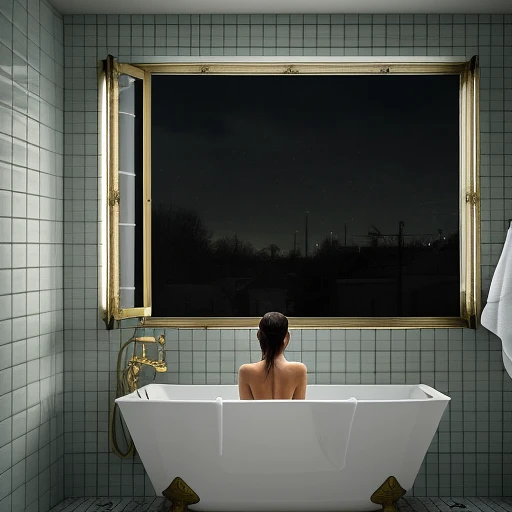 A detailed digital illustration in the style of Dimitry Roulland, featuring a woman in a bathtub, facing away from the camera her head turned sharply to the left, shouting "Occupied! " in surprise. The bathroom has white tiled walls and a vintage brass faucet. The scene is set at night, with city lights visible through a partially covered window. The woman has shoulder-length light brown hair, in motion from her sudden turn, and a shocked expression with wide eyes and an open mouth. She is submerged in slightly murky bathwater from her waist down, with her upper back and head visible. Her right hand is raised slightly out of the water. The lighting is soft and diffused, creating a warm and intimate atmosphere. The animation illustration style combines realistic details with a whimsical touch, characteristic of Roulland's style --no text --ar 9:16 --quality 2 --style raw --stylize 750 --v 6. 1