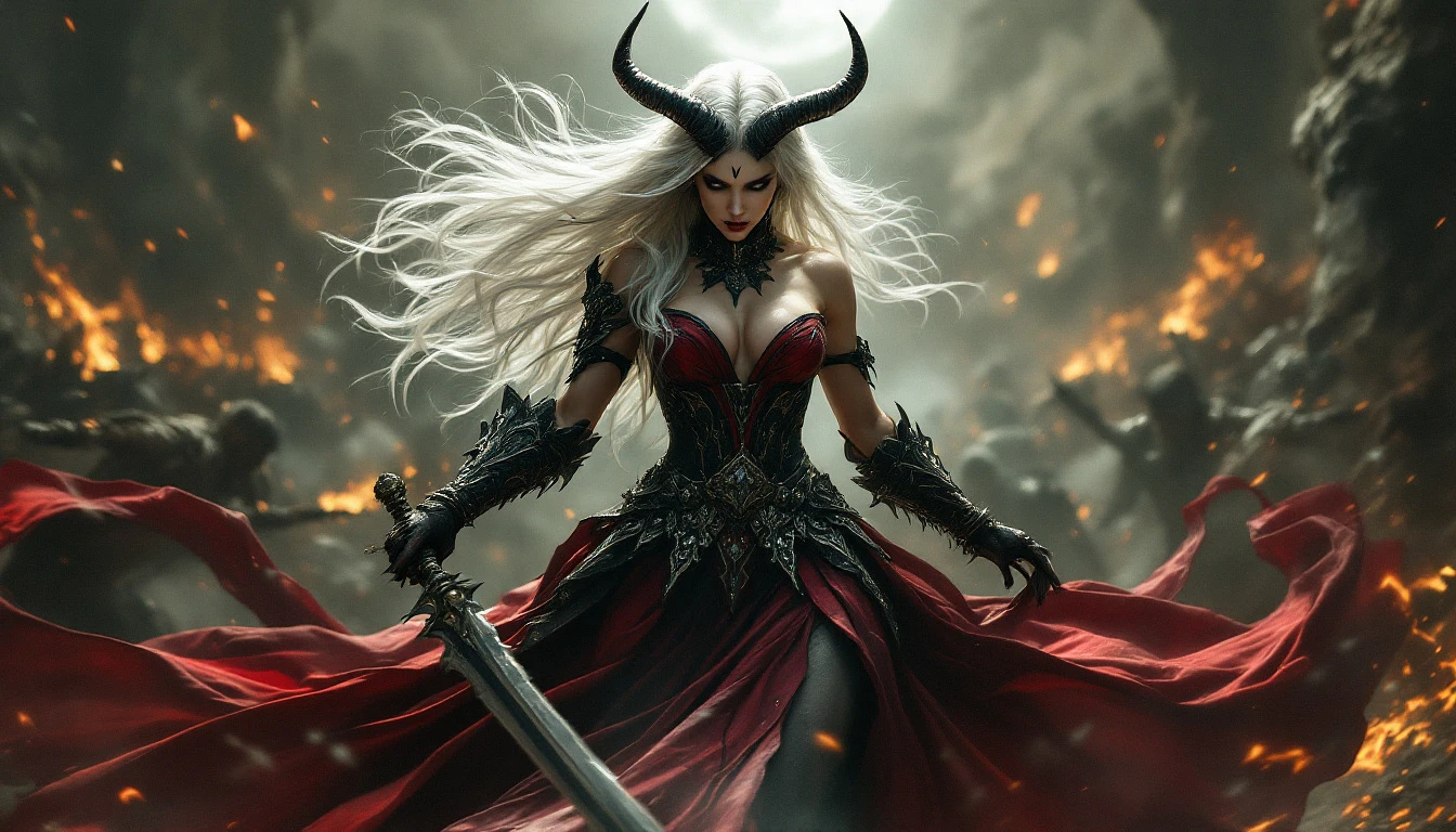 a breathtakingly dramatic portrait of a powerful woman, poised at the forefront of a intense battle scene. The atmosphere is one of dark fantasy and unbridled intensity, as if the very essence of chaos and turmoil has been distilled into this singular moment. The woman herself is a vision of striking beauty and formidable power, with long, flowing white hair that cascades down her back like a river of moonlight. Her horns are a majestic feature, curving outward from her forehead like a crown of dark, polished stone. Her attire is a masterful blend of dark fantasy and Gothic elegance, featuring a striking red and black dress with a long, flowing skirt that seems to billow behind her like a dark cloud. The dress is adorned with intricate, curved designs that seem to shimmer and shine in the flickering moonlight. A wide, studded belt cinches at her waist, adding a touch of dark, battle-hardened elegance to her overall ensemble. A pair of heavy, studded gauntlets adorn her arms, adding a touch of formidable power to her already intimidating presence. In her right hand, she wields a sword with a long, curved blade and a hilt adorned with intricate, Gothic-inspired designs. Her left hand grasps a weapon resembling an axe, with a heavy, studded head and a long, curved handle. The warriors arrayed behind her are a formidable sight, clad in armor and wielding an array of deadly weapons. Their faces are set in fierce, battle-hardened expressions, and their eyes seem to burn with a fierce, unyielding intensity. The background of the image is a sweeping landscape of dark, turbulent clouds and flickering, electric lightning. A full moon hangs low in the sky, casting an eerie, silver glow over the entire scene. The overall effect is one of breathtaking drama and intensity, as if the viewer has stumbled into a dark, fantastical realm of wonder and awe.