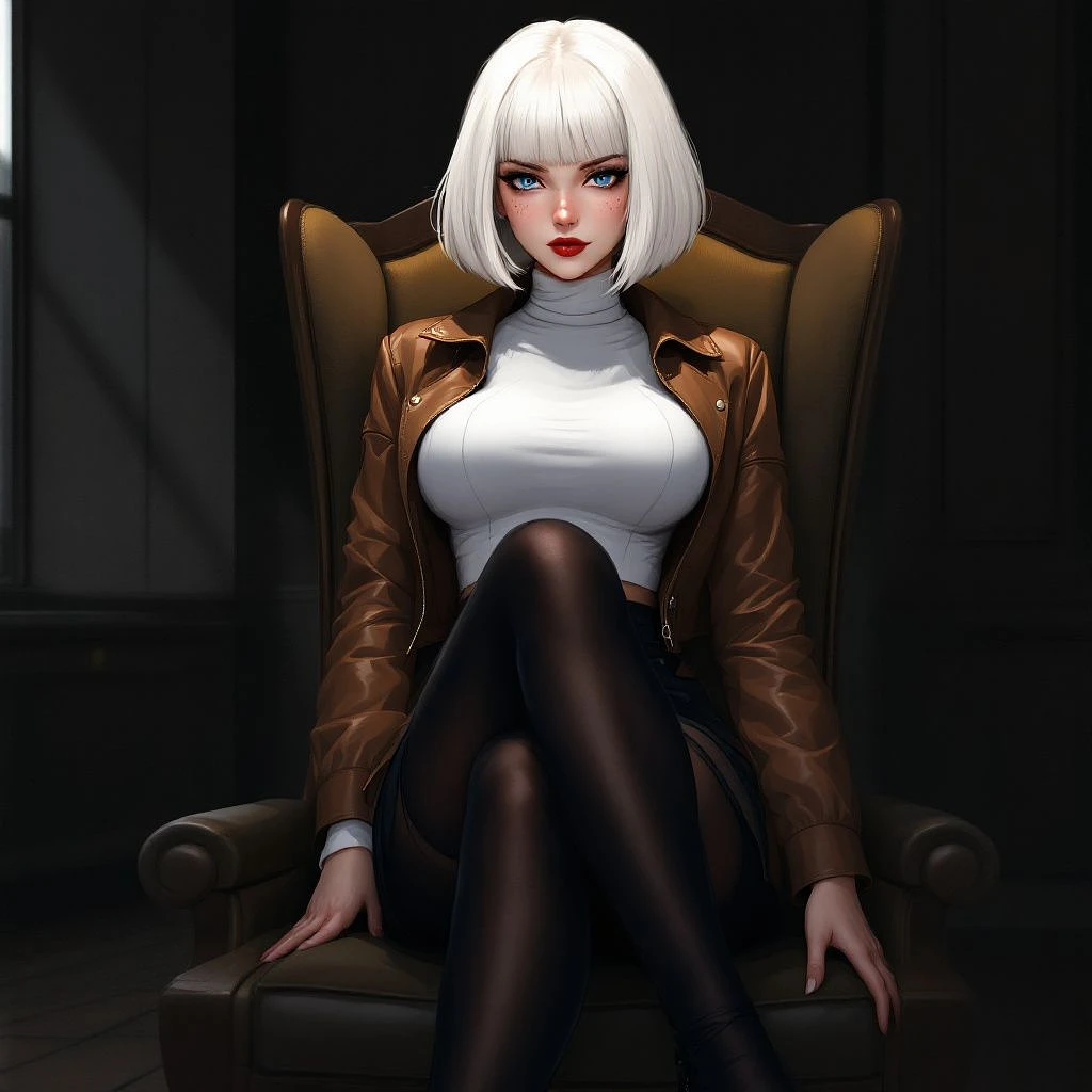anime, woman, white hair, bob cut, blue eyes, freckles, red lips, white sweater, tight sweater, short leather jacket, brown leather jacket, black tight skirt, black stockings, black high heels, stern expression, sitting on a chair, sitting with legs crossed, big chest