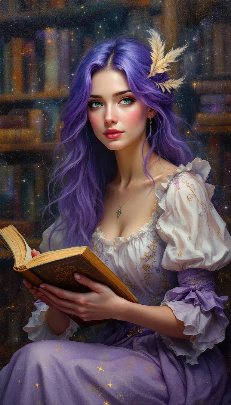 "Violet Storyteller in an Ethereal Library": A captivating abstract painting features a storyteller, exuding both grace and a profound love for narrative. She is a skilled performer, depicted in a library where the stories seem to swirl and shimmer around her, with a fair complexion, long, vibrant violet hair that seems to glow with an inner light, and a simple but elegant gown with detailed embroidery. Quill pens, books and scrolls adorn her hands and are attached to her sleeves. The artwork blends modern art and figure presentation to create a captivating scene using a palette including purples, whites, and golds. Her serene, green eyes, the composition’s focal point, convey both wisdom and a deep passion for the power of stories. After a long evening spent recounting tales of old, the storyteller embodies creativity and a connection to the depths of the human experience. The soft lighting and flowing design invite the viewer to explore the hidden narratives within this vibrant artwork, rendered as a painting.