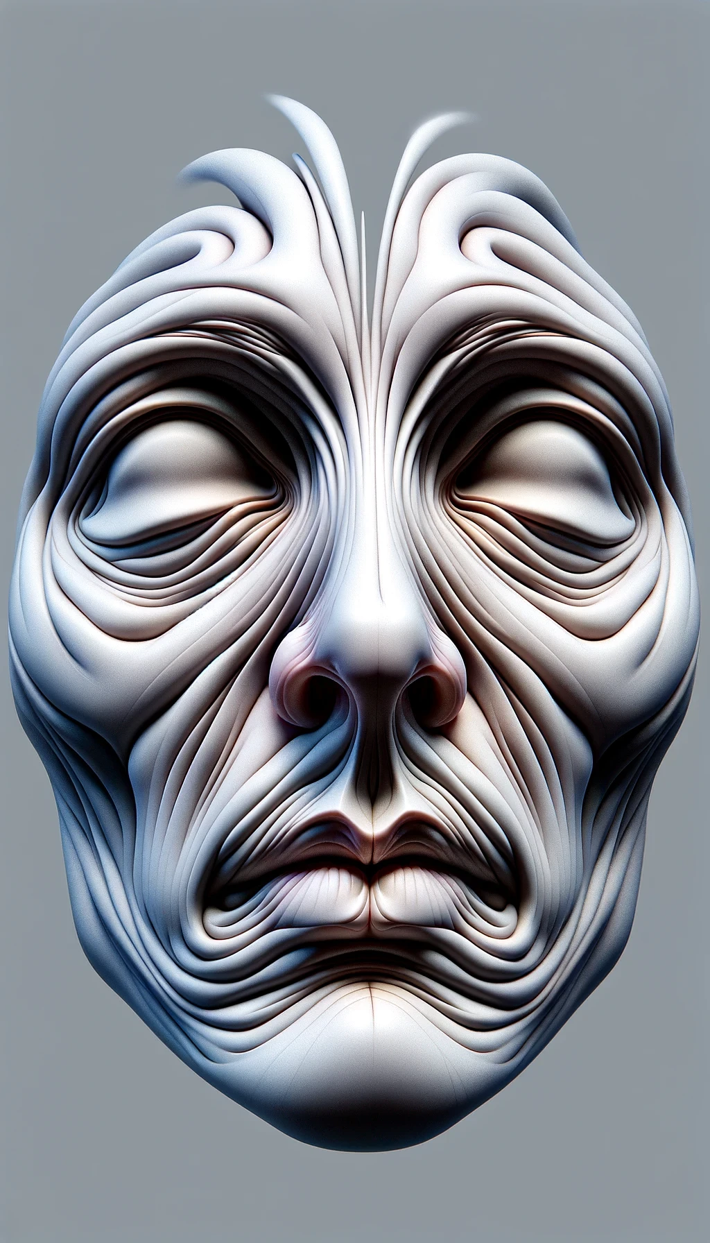 close-up view of a non-Euclidean, warped human figure's face in 3D Blender style, surreal and abstract, distorted features, surreal beautiful, eyes nose mouth in odd proportions, bending and twisting subtly. texture of the skin is smooth, add depth, dimension and shadows. harmonious color palette