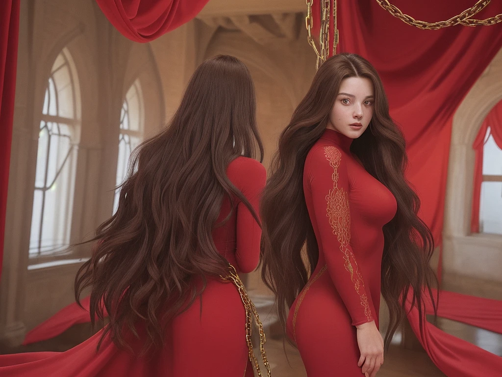 The woman stands confidently in front of a grand, red curtain that hangs from the ceiling of a medieval castle. Her long, wavy brown hair cascades down her back, framing her face and adding to her elegant demeanor. She wears a black, long-sleeved bodysuit made of a luxurious material that catches the light. The bodysuit features an intricate, chain-like design across the chest and abdomen, adding a touch of sophistication to the overall design. The background of the image is dominated by the grand, red curtain, which adds a sense of drama and luxury to the scene. The curtain is made of a thick, velvety material that catches the light, giving the image a sense of depth and texture. The overall effect is one of elegance and refinement, as if the woman is posing in a lavish medieval castle.