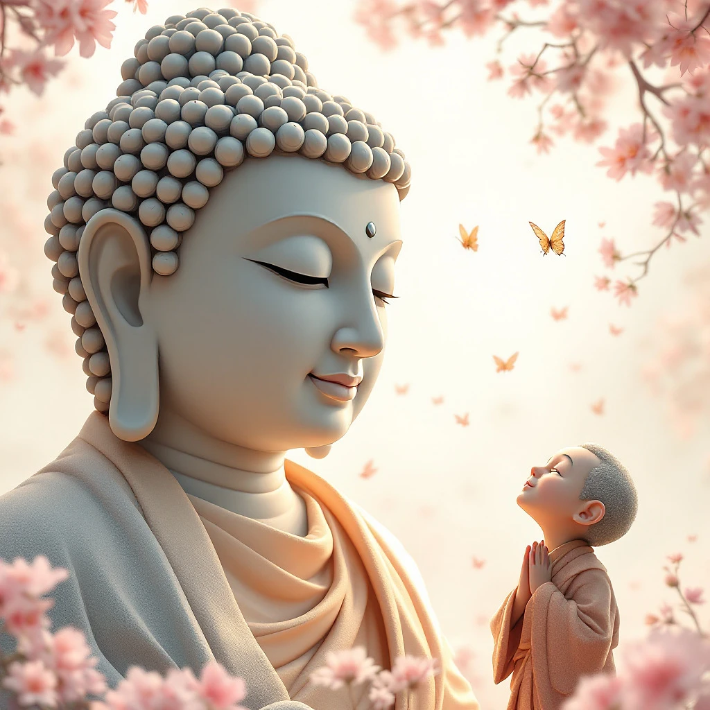 This is a beautifully 3d illustrated digital artwork depicting a serene and intimate moment between a large Buddha statue and a old monk. The Buddha has a calm, meditative expression with closed eyes, while the young monk gazes up at the statue with admiration and innocence. The artwork has soft, pastel colors, delicate floral patterns in the background, and intricate details in the monk’s robe and the Buddha’s textured curls. The scene radiates peace, wisdom, and spiritual connection, enhanced by the gentle presence of butterflies.
