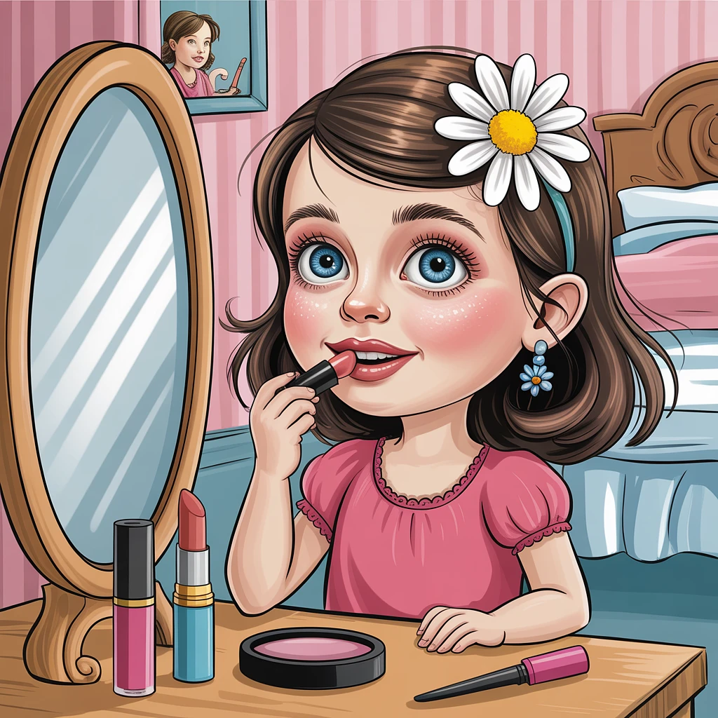 Caricature. whimsical, little lady, playing with moms lipstick, looking in the mirror while putting it on her lips, looking at the viewer, she has blue eyes, brown hair, a daisy in her hair, pink dress, bg is moms bedroom, detailed,